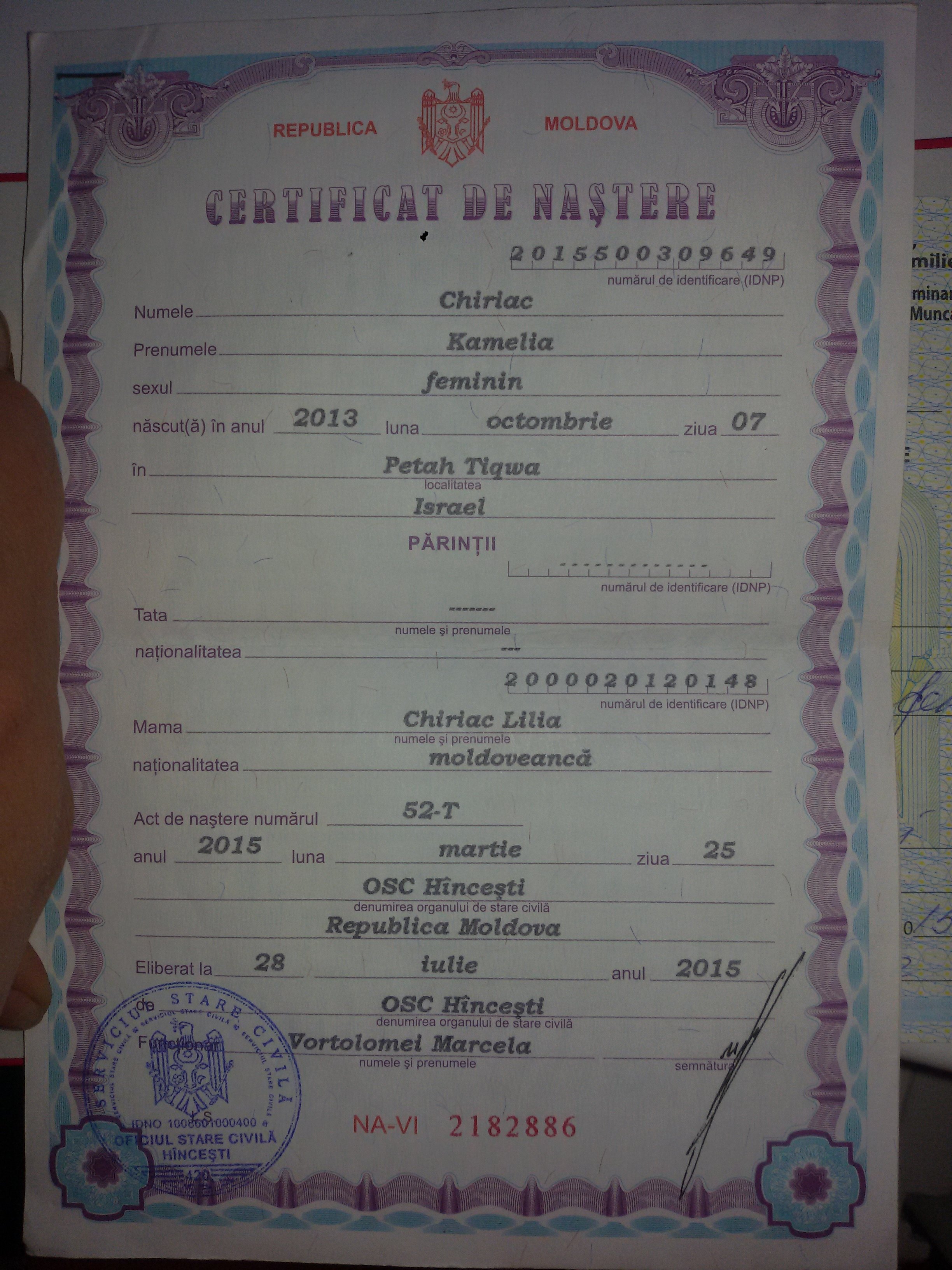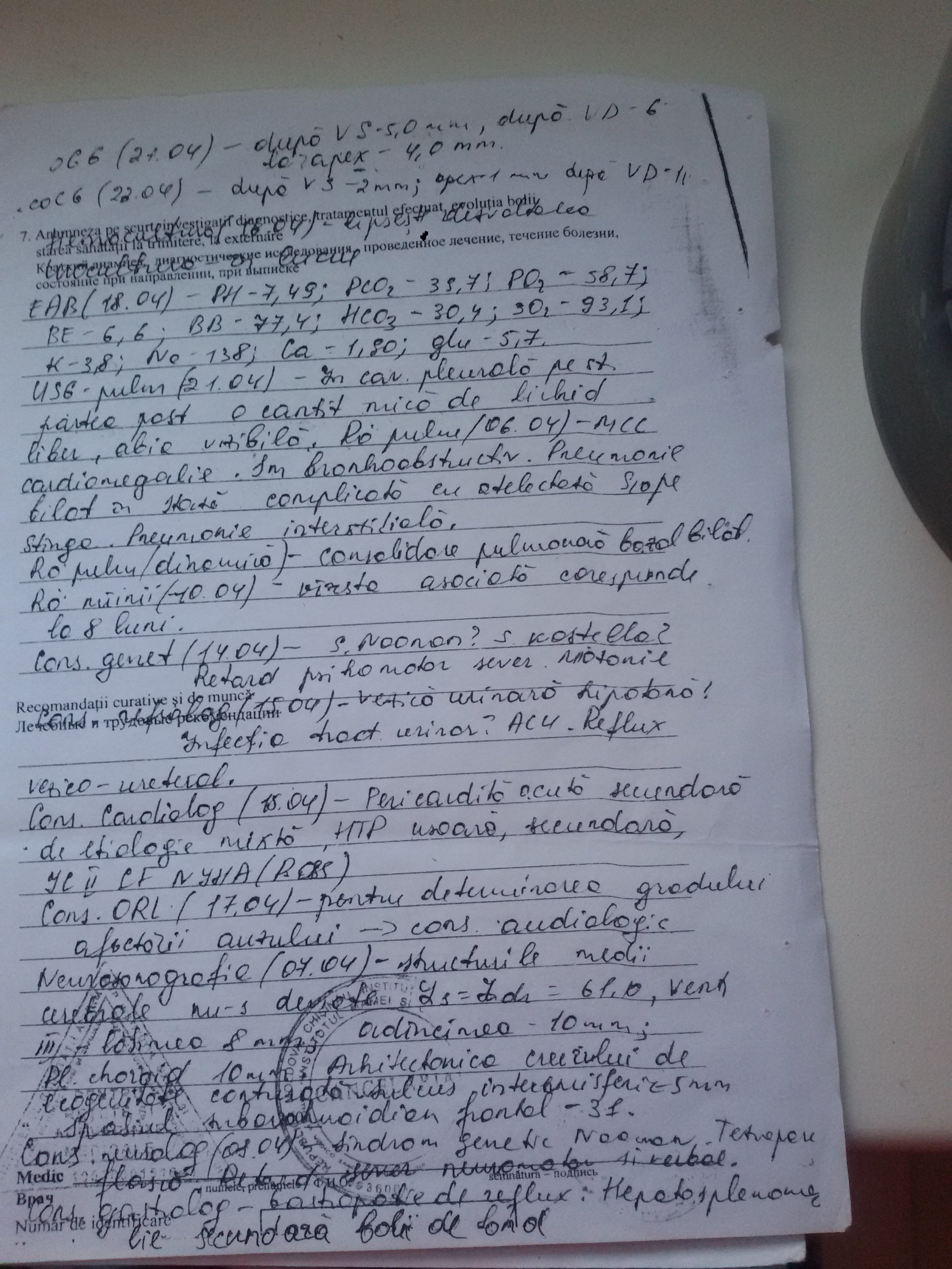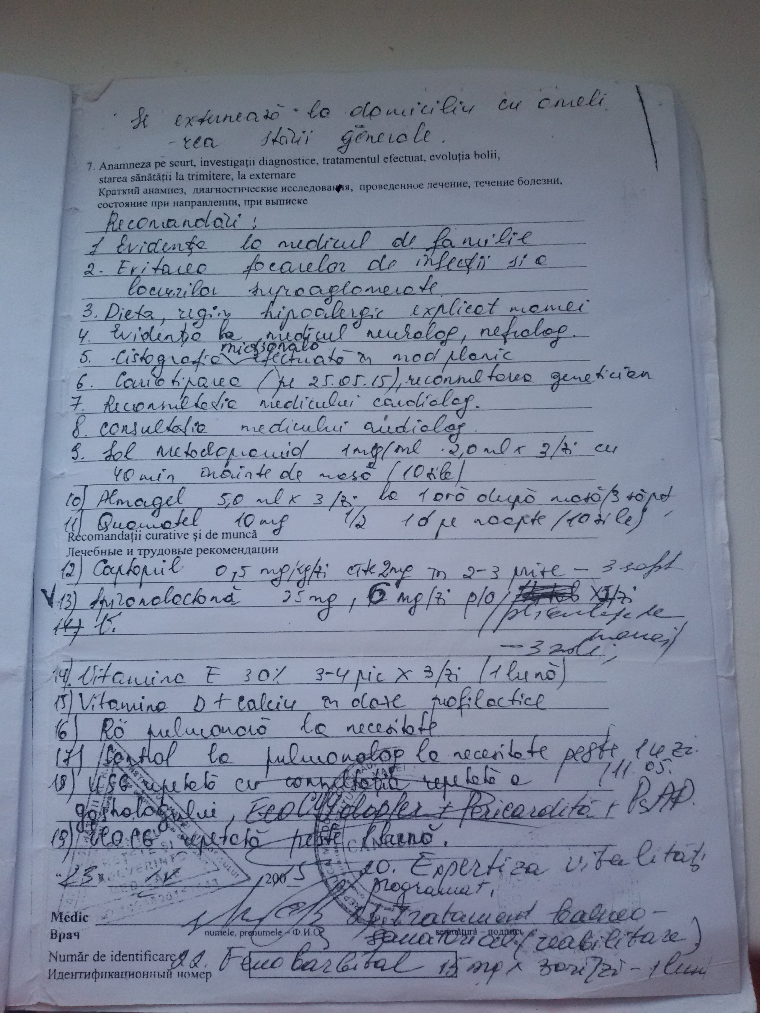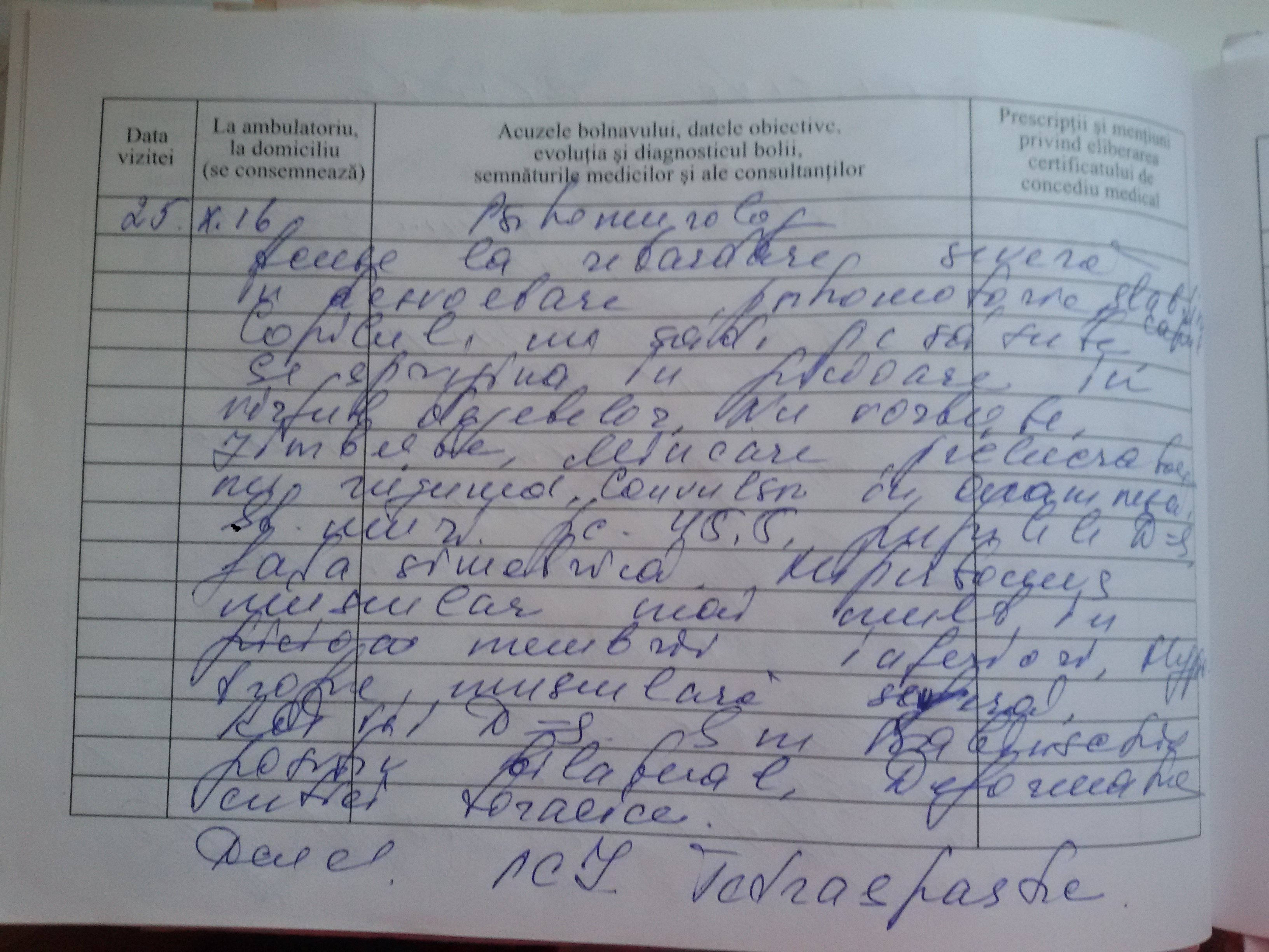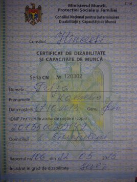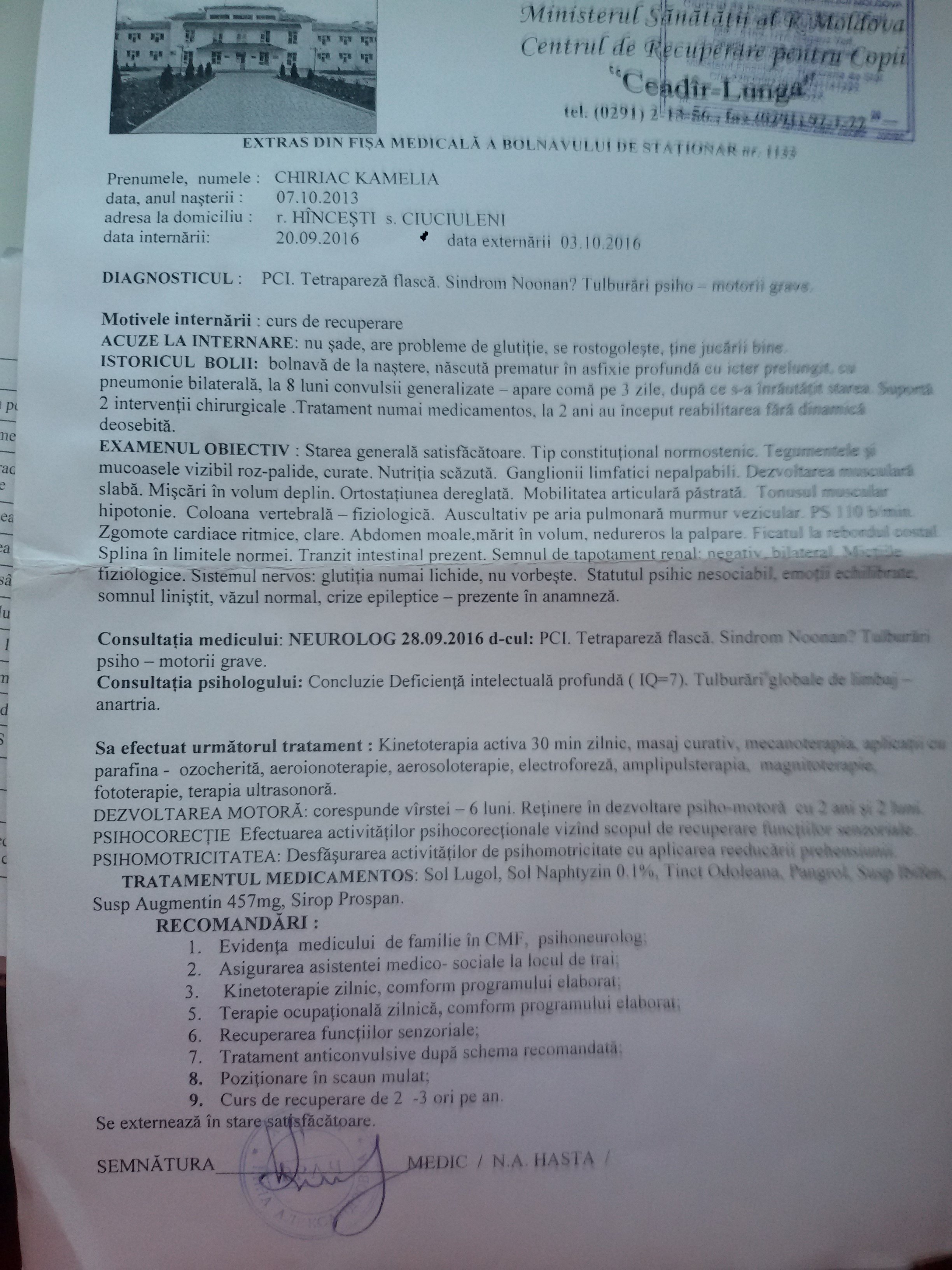 Fetița sa născut prematur la 32 săptămîni și cîntărea 1,700 kg nu a respirat la naștere și a fost conectată la aparate. Iar dupa o lună și jumate ne-am externat cu un pui de om de 2,500 kg. A fost bine, cu mici probleme dar a fost, numai că dupa opt luni a făcut convulsii și a ajuns în coma conectată din nou la aparate. Iar cînd și-a revenit, medicii ne-au spus că a suferit o asfixie și timpul va arata cît de gravă poate fi. Au trecut deja trei ani, iar consecințele s-au arătat rînd pe rînd - noi nu putem vorbi, nu mergem. Am început cu greu să stăm pe șezute. Pe scurt, fetița noastră e diagnosticată cu PCI și Tetrapareză flască retard psihomotor și verbal. Pîna acum am facut totul singuri că să înăintăm spre bine și să avem succese mici, dar noi ne bucurăm și de cele mici, pîna vor veni cele mari.