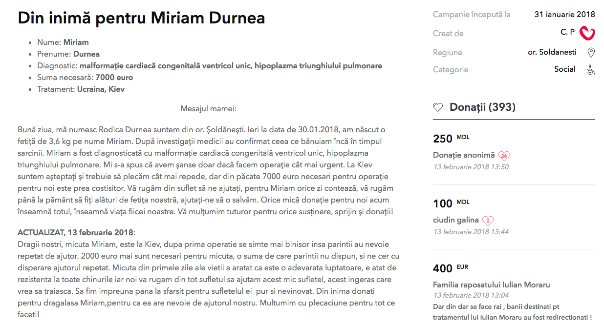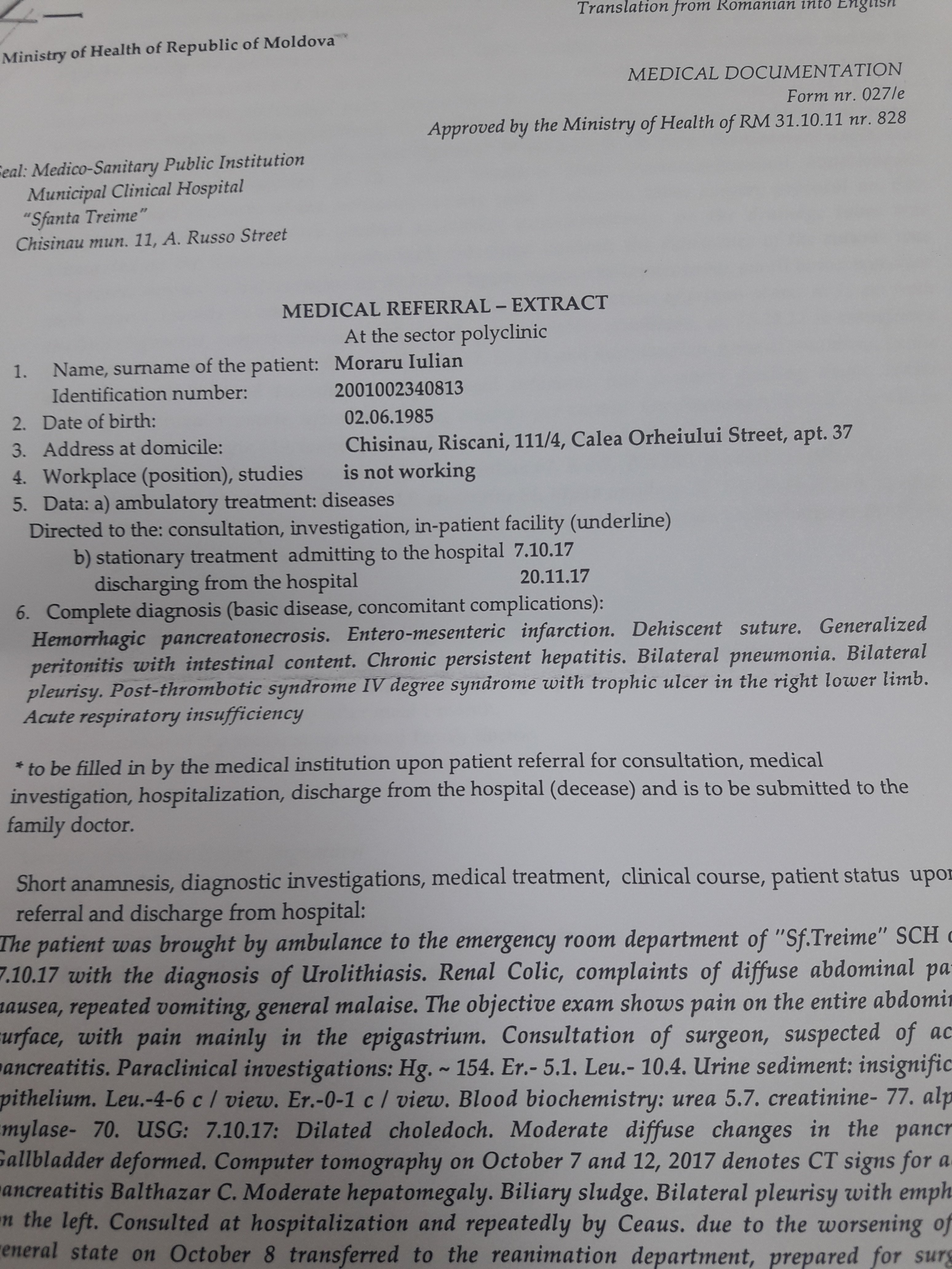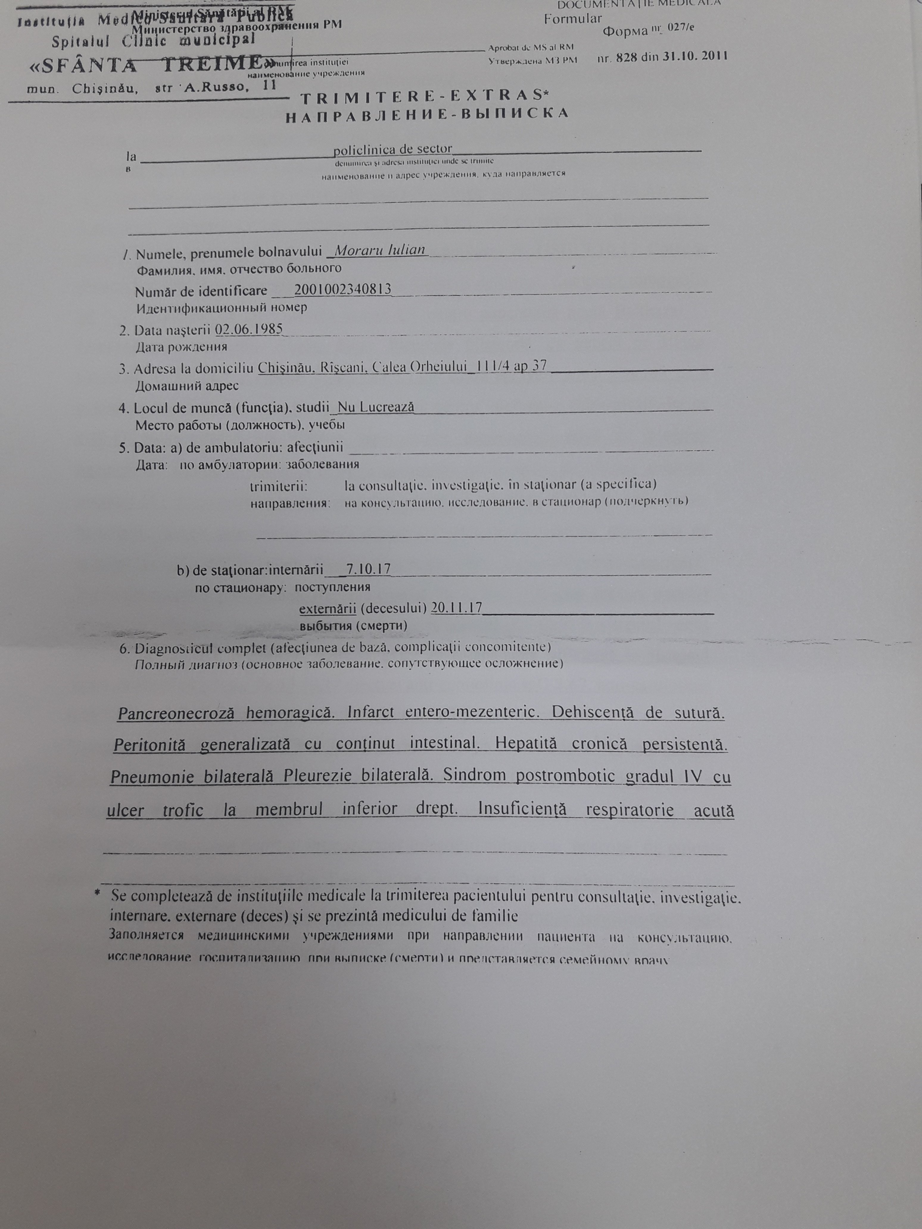 Bună ziua. Mă numesc Ana, locuim în Chișinău, soțul meu se numește Moraru Iulian, are 32 de ani și se află într-o stare foarte gravă la spitalul Sfânta Treime din Chișinău. Iulian are nevoie de transplant de intestin subțire, pe care îl putem face doar peste hotare. Avem foarte puțin timp (4 luni) pentru a acumula suma necesară. Oameni cu suflet mare, vă rog să ne ajutați!!! Sunt sigură că mâna la mâna, vom acumula suma necesară și vom salva încă o viață. Vă rog să nu fiți indiferenți. Cu 2 luni înainte nici nu-mi puteam imagina că așa ceva se va întâmpla în familia noastră. Vă rog din suflet să ne ajutați.