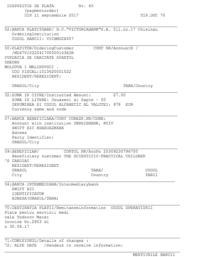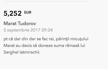 Dragii noștri, astăzi am redeschis contul lui Marat, în urma discuției cu tatăl copilului, unde ne anunță că investigațiile făcute recent arată că Marat are o infecție în sânge. La fel i s-a făcut și o angiografie la inimă înainte de operație. Părinții sunt disperați pentru că costurile ajung la 11.000 euro. Operația este una complicată, de acee părinții ne imploră, ne roagă să-i ajutăm până la urmă, ne roagă să facem un mic efort pentru Marat. Și pentru că viața este făcută din șanse, vă rugăm și noi să-i oferim lui MARAT O ȘANSĂ LA VIAȚĂ. El merită să trăiască. Multumim din suflet.