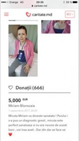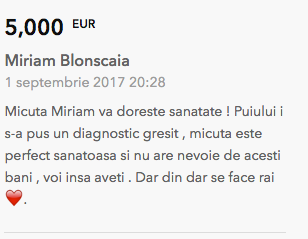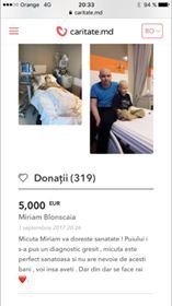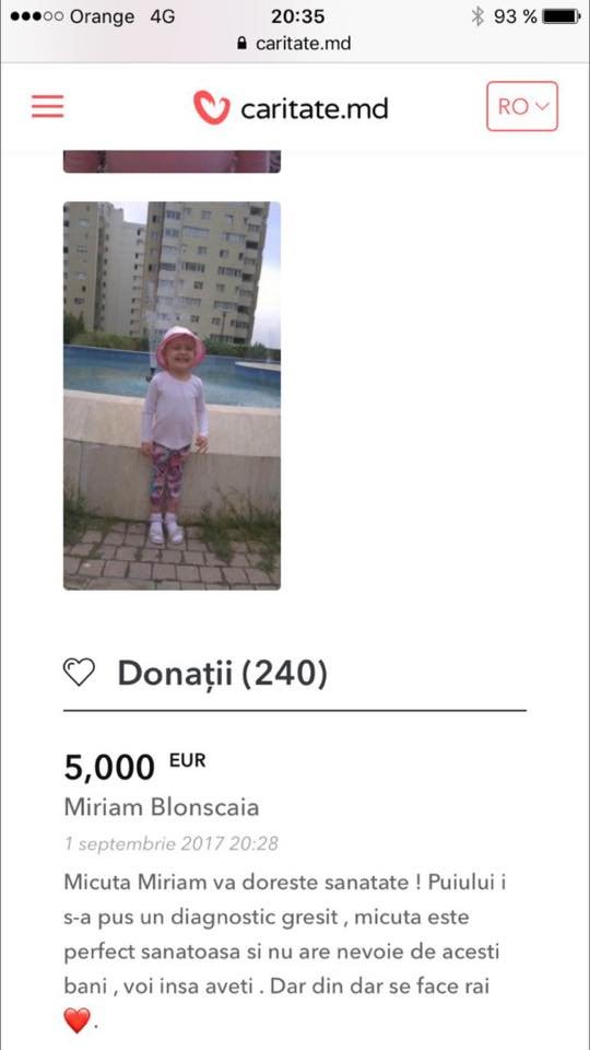 Ma numesc Cristina Blonscaia si sunt din Chisinau . In data de 30.05.2017 Dumnezeu ne-a daruit-o pe Miriam . Sufletul nostru de fetita pe care am asteptat/o o viata . Este aerul si universul nostru . La doar cateva saptamani dupa nastere , medicii ne-au dat o veste care pur si simplu ne-a impartit viata in 2 etape.... - pana si dupa ....Acum