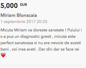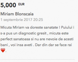 viata noastra inseamna lupta pt viata fetitei noastre Miriam .....Miriam sufera de cancer la glanda salivara, un diagnostic crunt ce ii pune viata in mare pericol. Clinica " American Hospital" din Istanbul este gata sa o opereze de urgenta , dar noi ca parinti nu ne permitem sa " cumparam" viata fetitei noastre . 20.000 euro este o suma enorma pt noi . Impreun cu prietenii si rudele am colectat suma pt primele investigatii si analize, dar este o nimica toata pe linga suma necesara . Va rugam pana la pamant.., fiti alaturi de fetita noastra si ajutati/ne sa o salvam. Orice mica donatie sau distribuire va fi un mare ajutor pt ea. Dumnezeu sa va binecuvinteze , va multumim din inima tuturor anticipat!