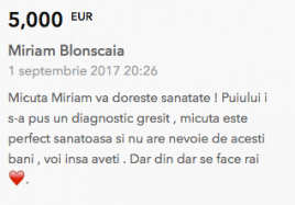 Miriam este așteptat de echipa de medici, practic totul este gata, doar că a rămas un detaliu, suma necesară pentru tratament și operație nu este colectată. Știm cu toții atunci când ne unim forțele putem face minuni. Miriam are nevoie de un miracol, are nevoie de NOI, are nevoie de donațiile noastre. Ne rugăm pentru acest suflețel minunat și vă rugăm să donați pentru pici. Orice copilaș trebuie salvat, doar împreună vom salva vieți. Mulțumim!