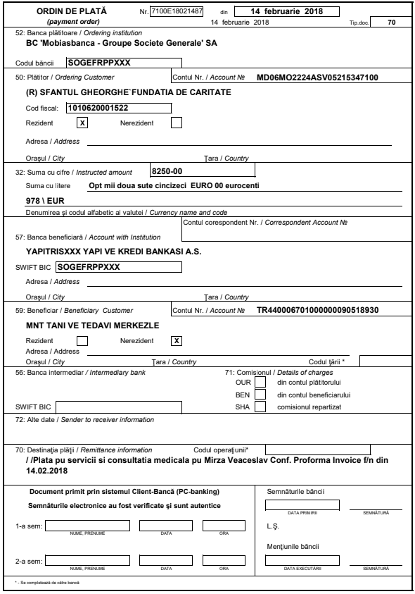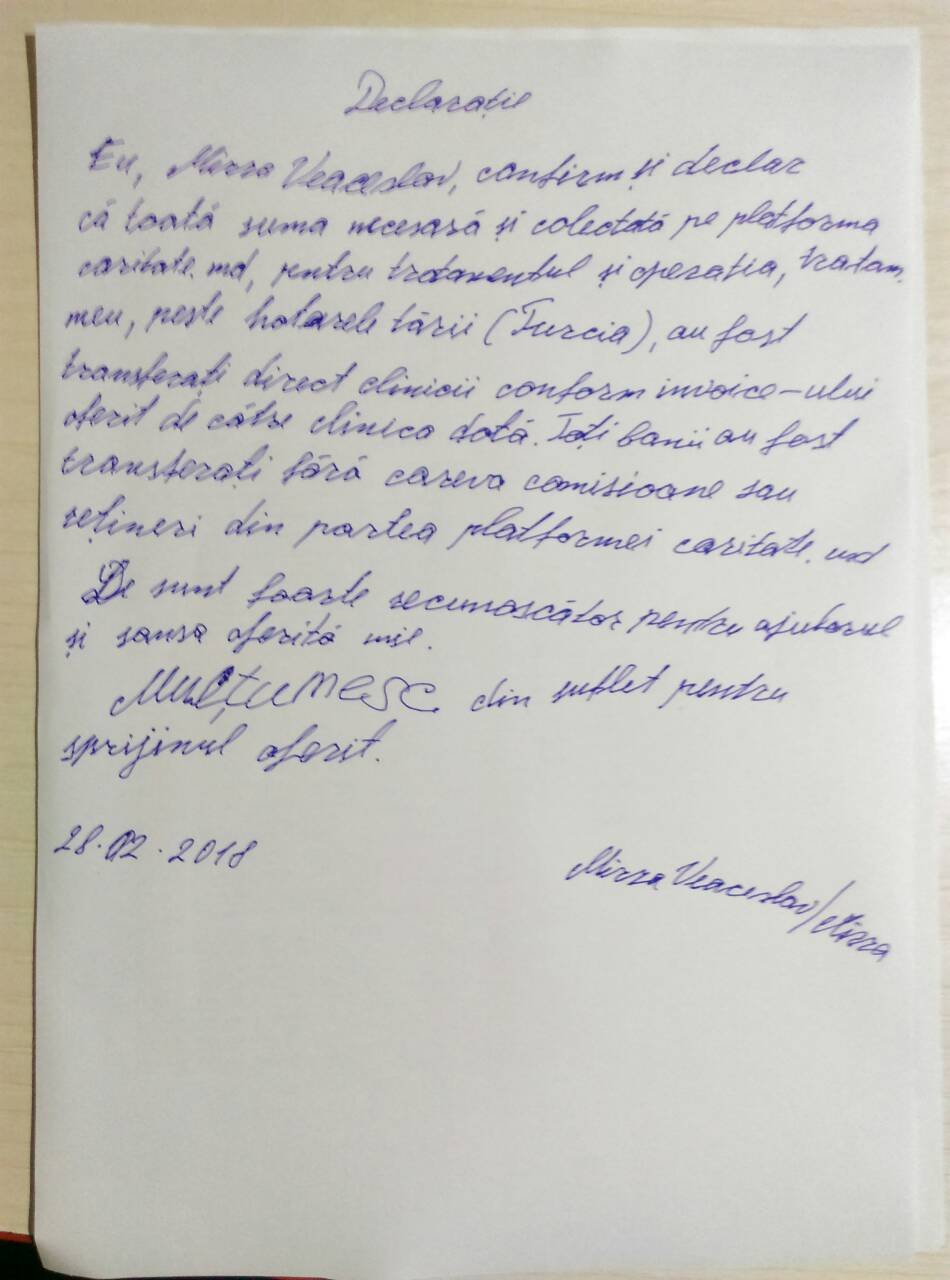 Bună ziua la toți, sunt Veaceslav din Chișinău și din anul 2009 am fost diagnosticat cu tumoare cerebrală. Pe bază de epilepsie am făcut RMN cerebral, unde am aflat cumplita noutate. În martie 2010 mi s-a făcut o intervenție chirurgicală, unde a fost înlăturată tumoarea pe baza radioterapiei. Din cauza că epilepsia nu ceda după 6 ani am mai făcut o intervenție după care am fost anunțat că va fi nevoie în fiecare an să fac astfel de intervenții, căci nu există tratament. Pentru mine și familia mea toți acești ani au trecut în suferință și chin. De aceea am decis să căutăm informație, și din fericire pentru mine, am primit o șansă la o clinică din Turcia. Aici am primit recomandare să fac un tratament ce îmi oferă șansa la viață. Am apelat la Dvs., în speranța de a strânge bani pentru a pleca cât mai repede la clinica din Germania. Vreau să vă rog să mă ajutați, căci vreau să trăiesc pentru familia mea. Avem de crescut copilașul și foarte mult sper că acest tratament să mă ajute să mă pun pe picioare. Vă rog din suflet ajutați-mă. Ca niciodată am nevoie de oameni cu suflet mare. VĂ MULȚUMESC ȘI DOMNUL SĂ NE FIE DE AJUTOR!!!