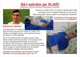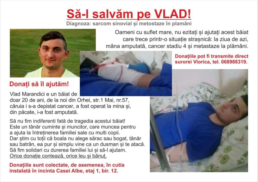 Vlad deja și-a pierdut mîna dreaptă, fiind amputată cîteva zile în urmă... Sora lui Vlad a trimis diagnoza ui în Germania și așteaptă răspuns despre costurile tratamentului. Pînă vom avea aceste date, ne propunem să colectăm suma de 10.000 euro, cu siguranță tratamentul va fi de cîteva zeci de mii de euro, acest tip de cancer fiind unul dintre cele mai groznice !!!