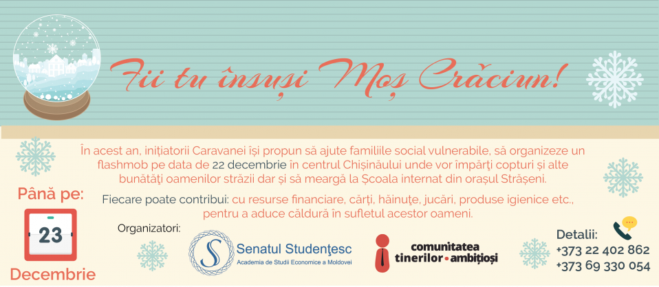 Between November 21 and December 23, 2016 A.O. Comunitatea Tinerilor Ambițioși (Community of Ambitious Youth) and ASEM Student Senate organize a Christmas Caravan. These young men invite us to join their charitable campaign.